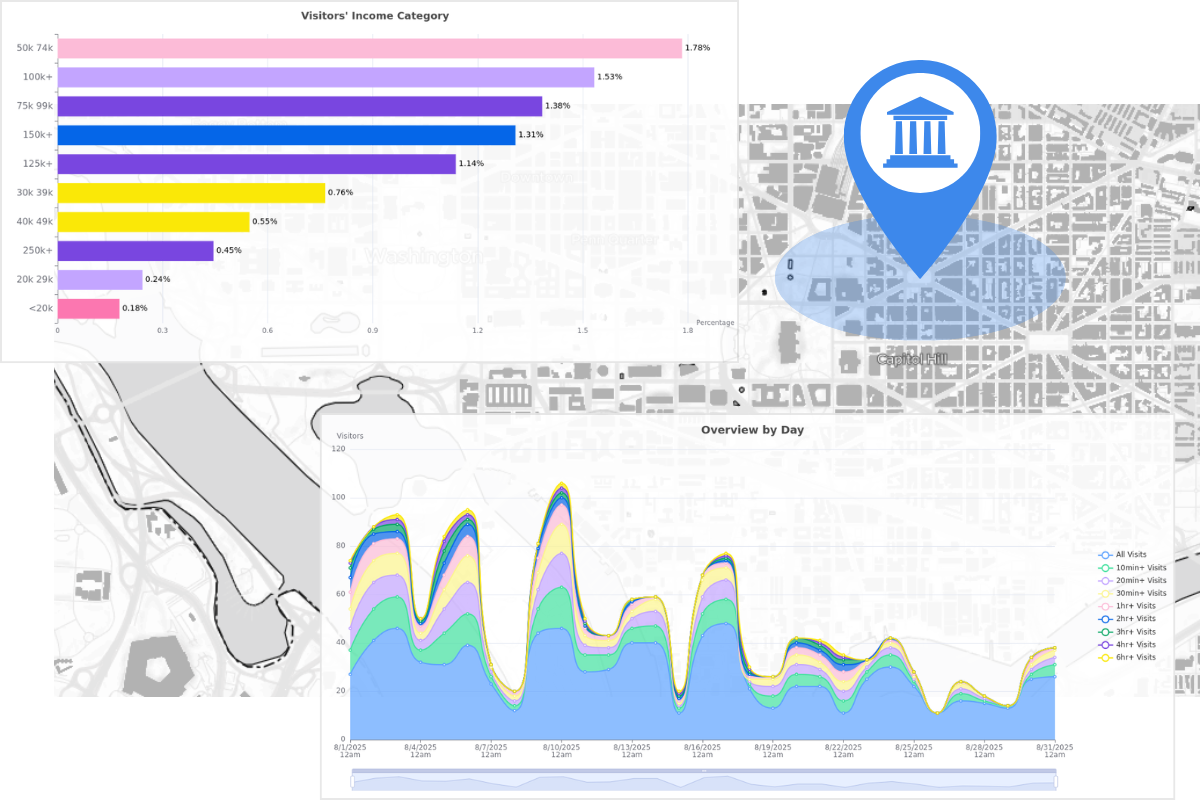 Analyze traffic flow, visitation patterns, and area activity to inform development planning, zoning decisions, public space design, and infrastructure investment.